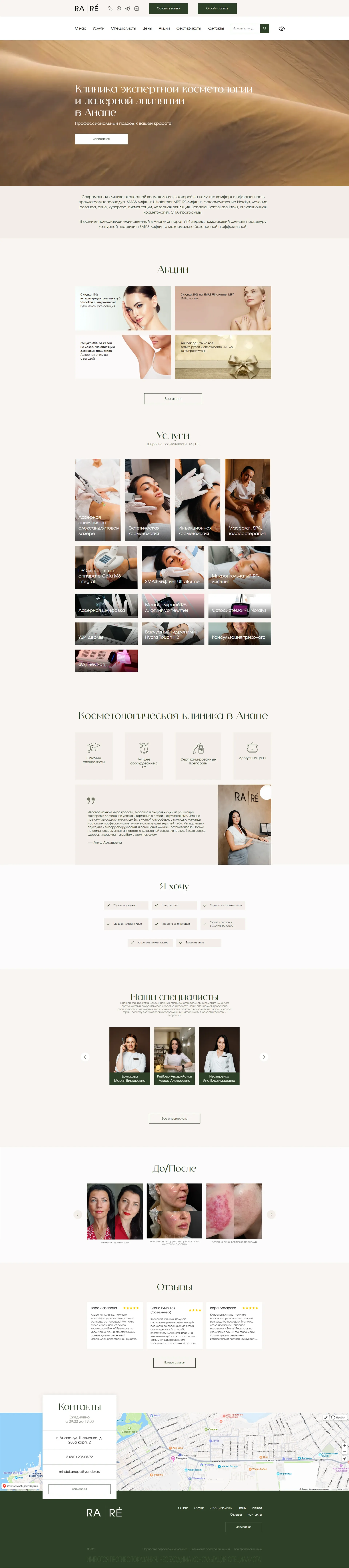 Создать сайт для клиники «RA | RÉ» в Анапе, который бы гармонично передавал философию бренда — сочетание современных технологий и эстетического подхода к уходу. Основной целью было сформировать визуально привлекательный и удобный интерфейс, способный структурировать услуги, повысить доверие клиентов и облегчить процесс записи на услуги